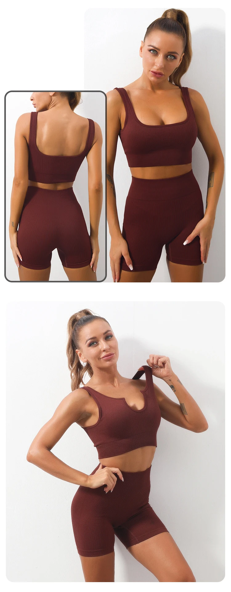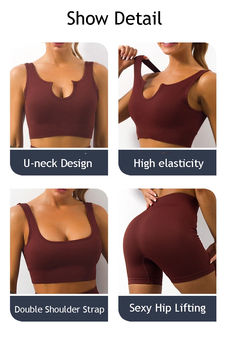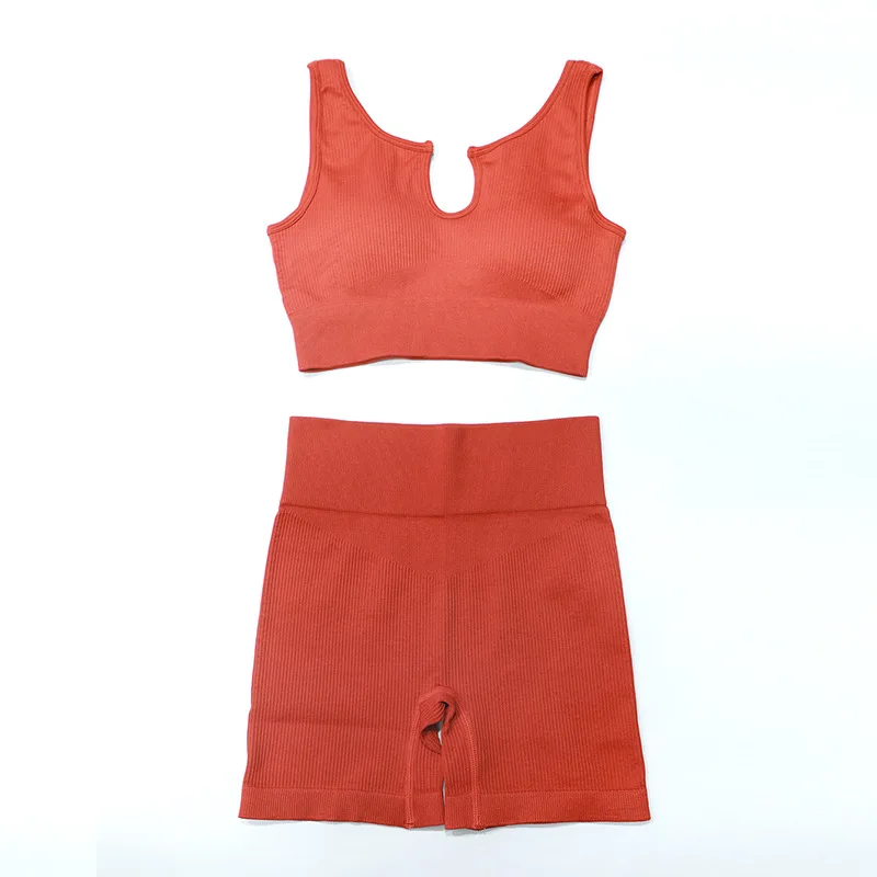 Product Name 2 Piece Sports Bra and Shorts Set Seamless Ribbed Sexy U Neck Low Cut Exercise Fitness Sportswear Women Workout Gym Sets