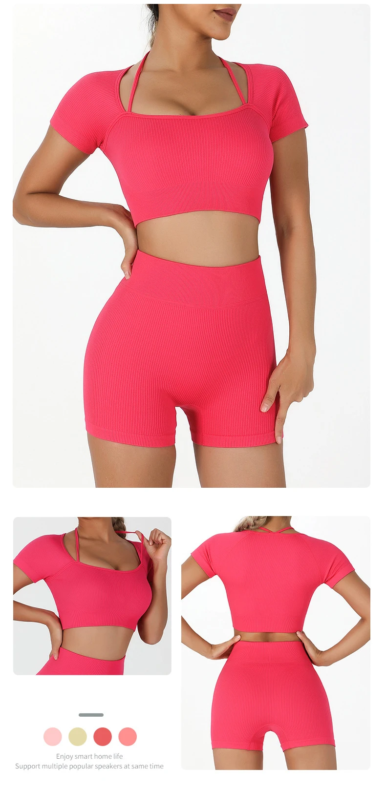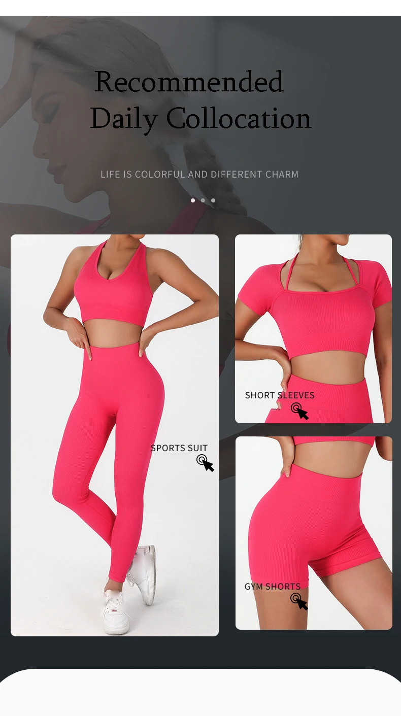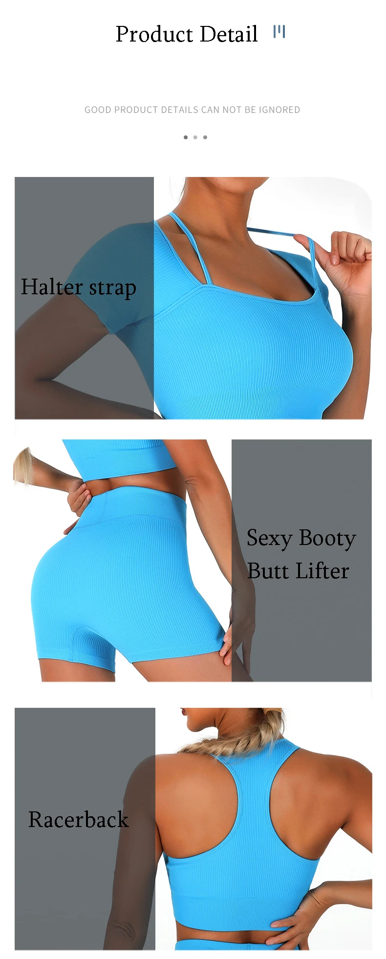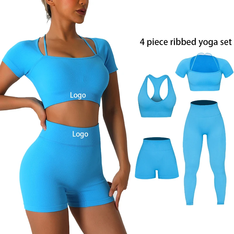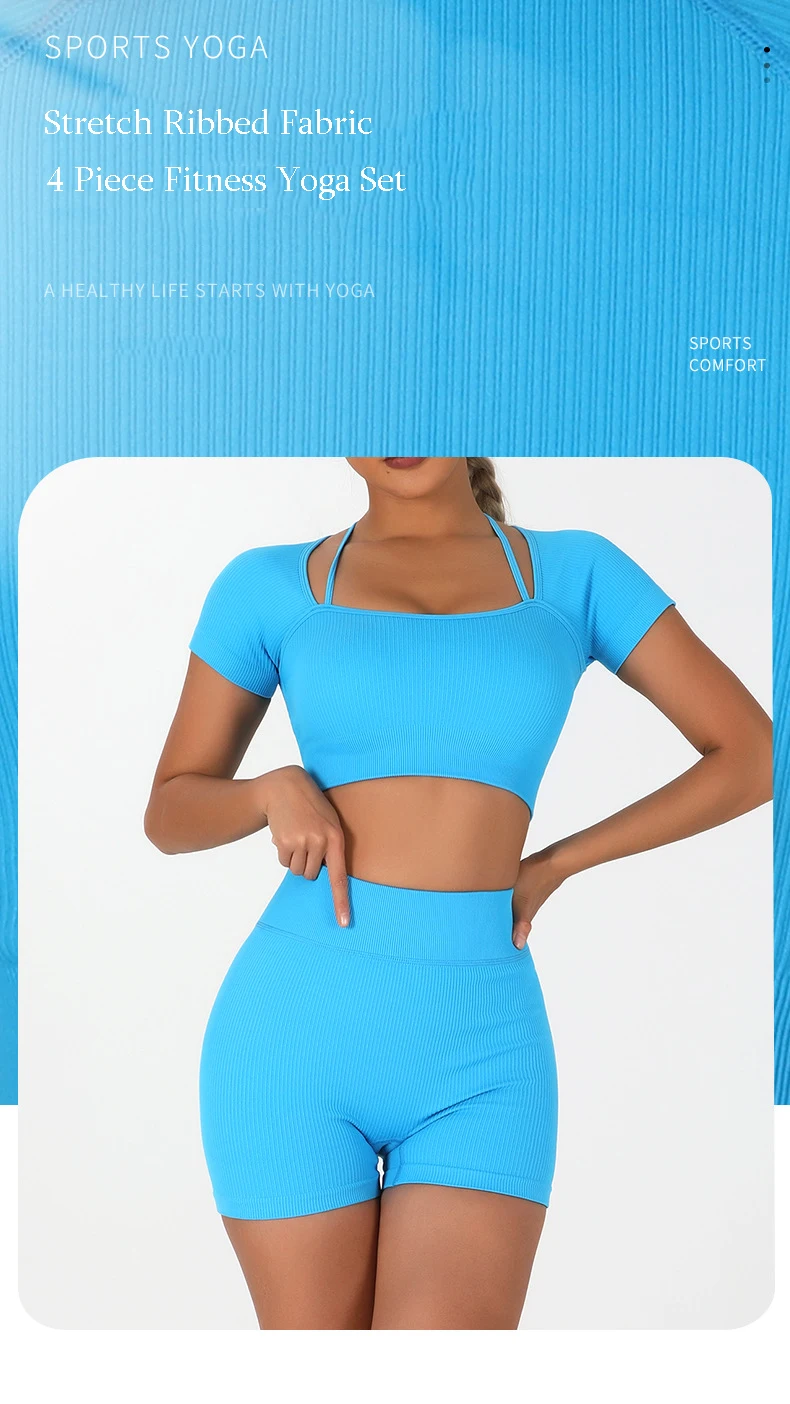 Product Name 4 Piece Sports Yoga Sets Athletic Gym Wear Ribbed Halter Strap Bra Racerback Short Sleeve Shorts Leggings Workout Set Women