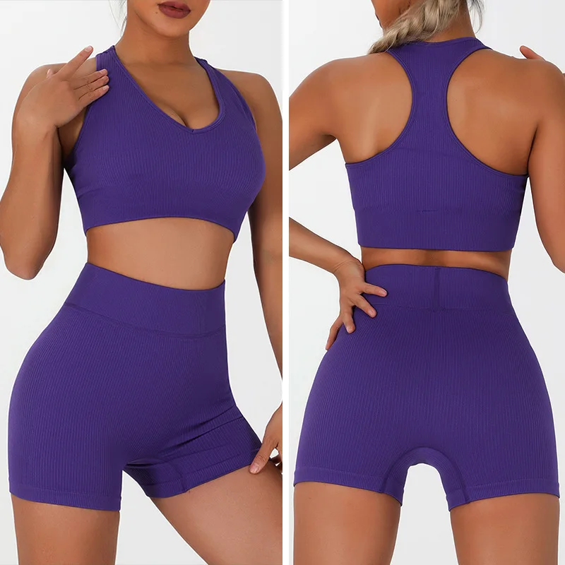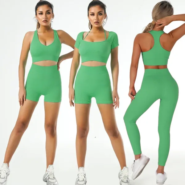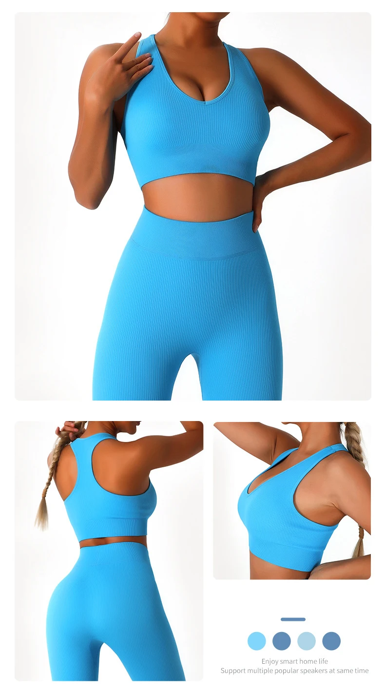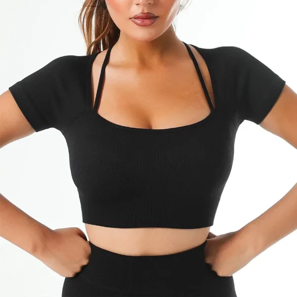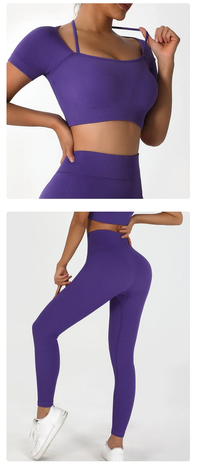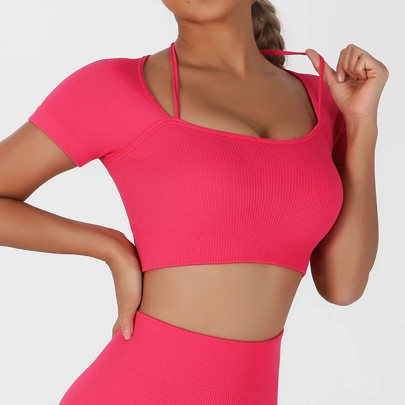 Product Name 4 Piece Sports Yoga Sets Athletic Gym Wear Ribbed Halter Strap Bra Racerback Short Sleeve Shorts Leggings Workout Set Women