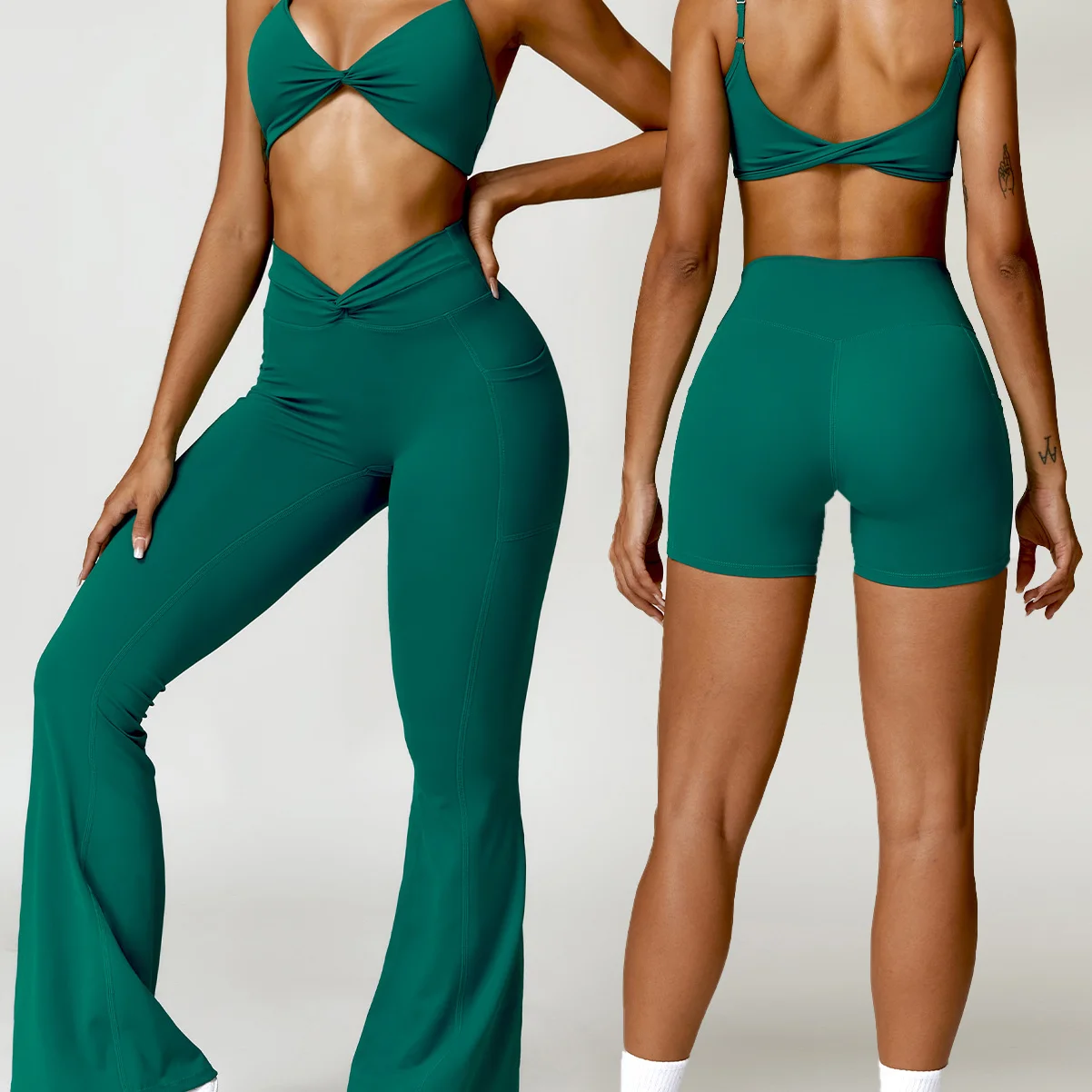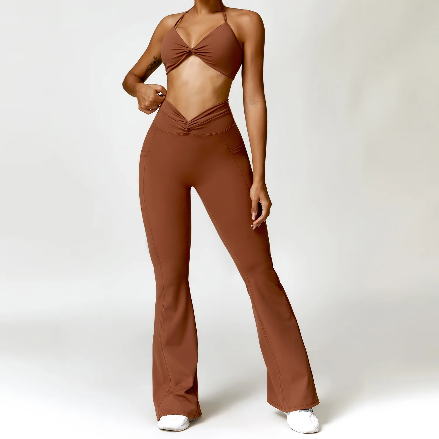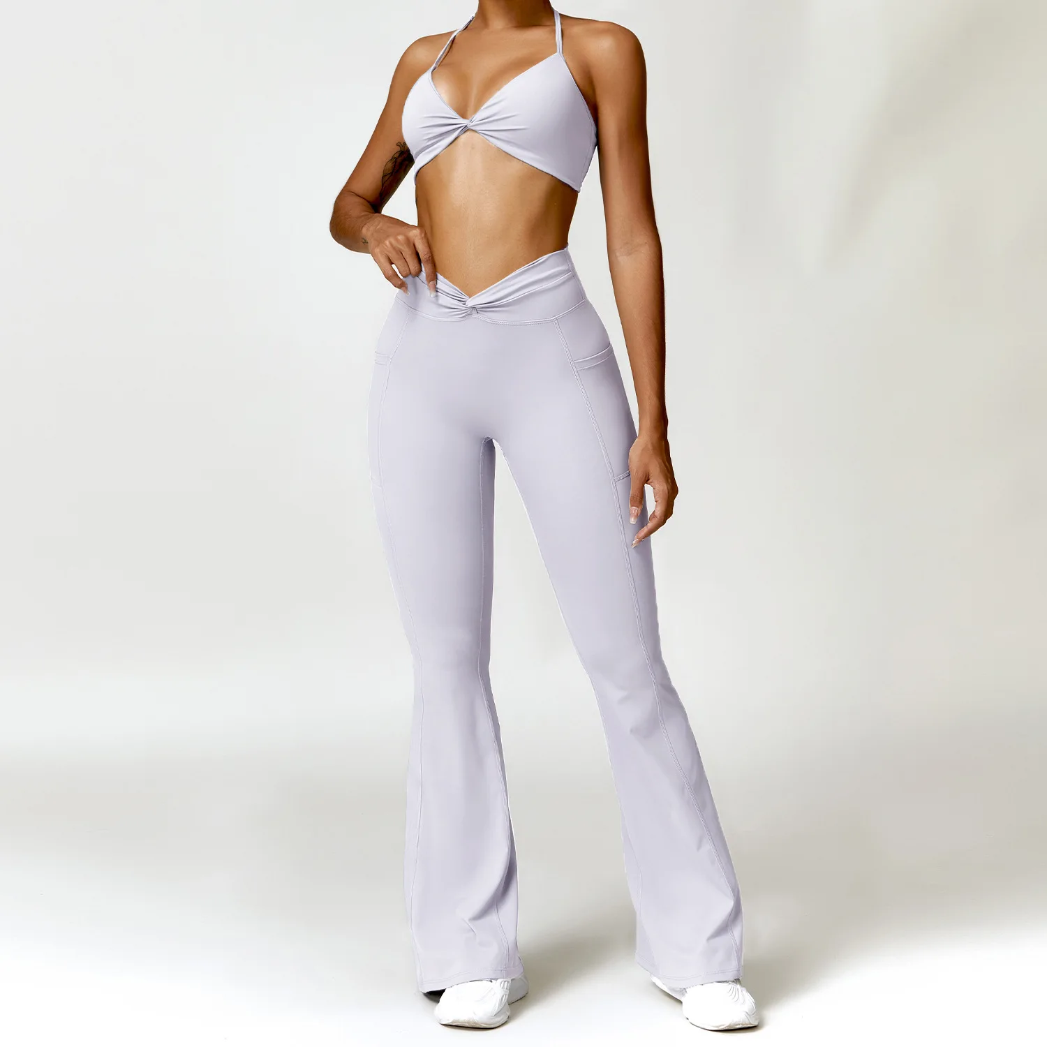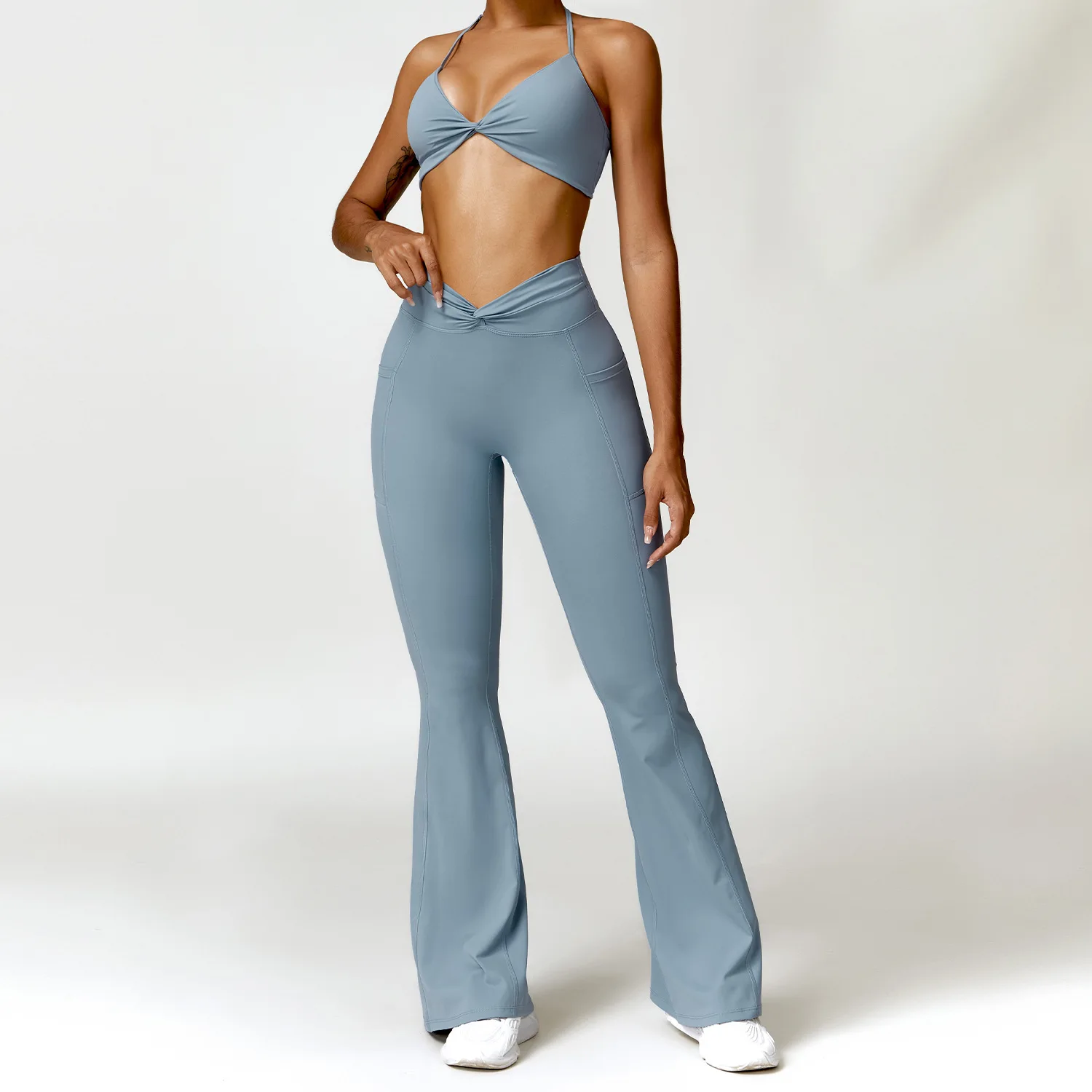 | Product Name | Custom Logo 2 Piece Ribbed Gym Sets Lace Up Back Sports Crossover High Waist Flare Solid Workout Sets For Women |