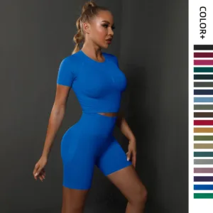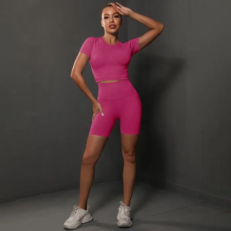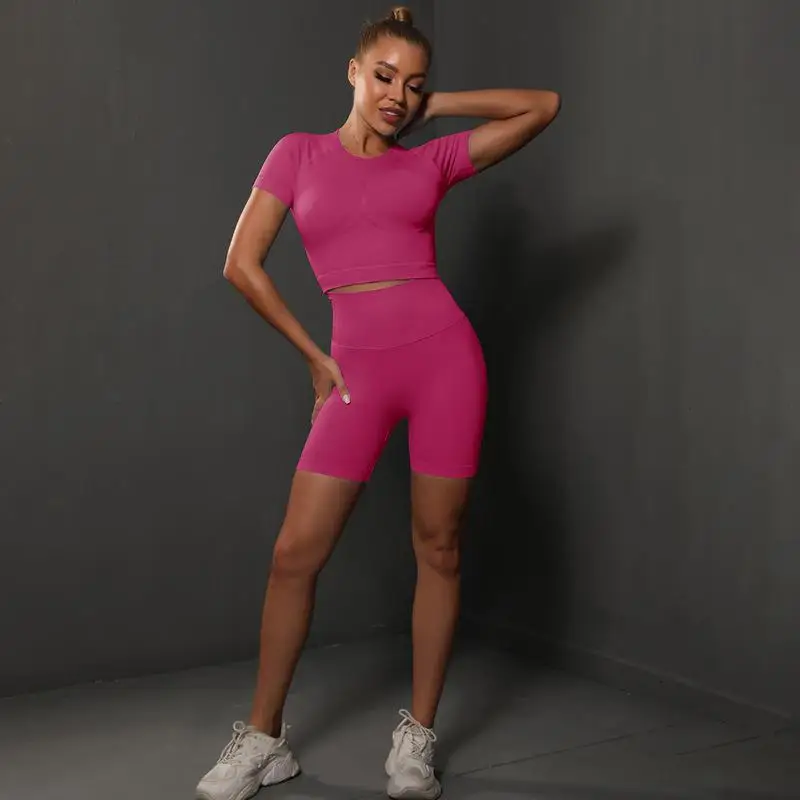 Custom Logo Summer Ladies Sports Outfit Gym Wear High Elastic Peach Butt 2 Piece Short Seamless Yoga Set