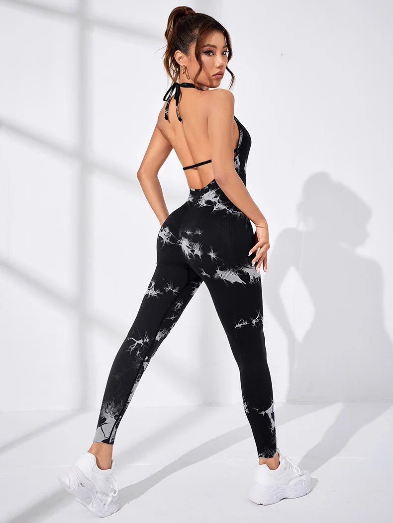 New Lightweight One Piece Sportswear Backless Tie Dye Print Seamless Halter Women Yoga Bodysuit Jumpsuits