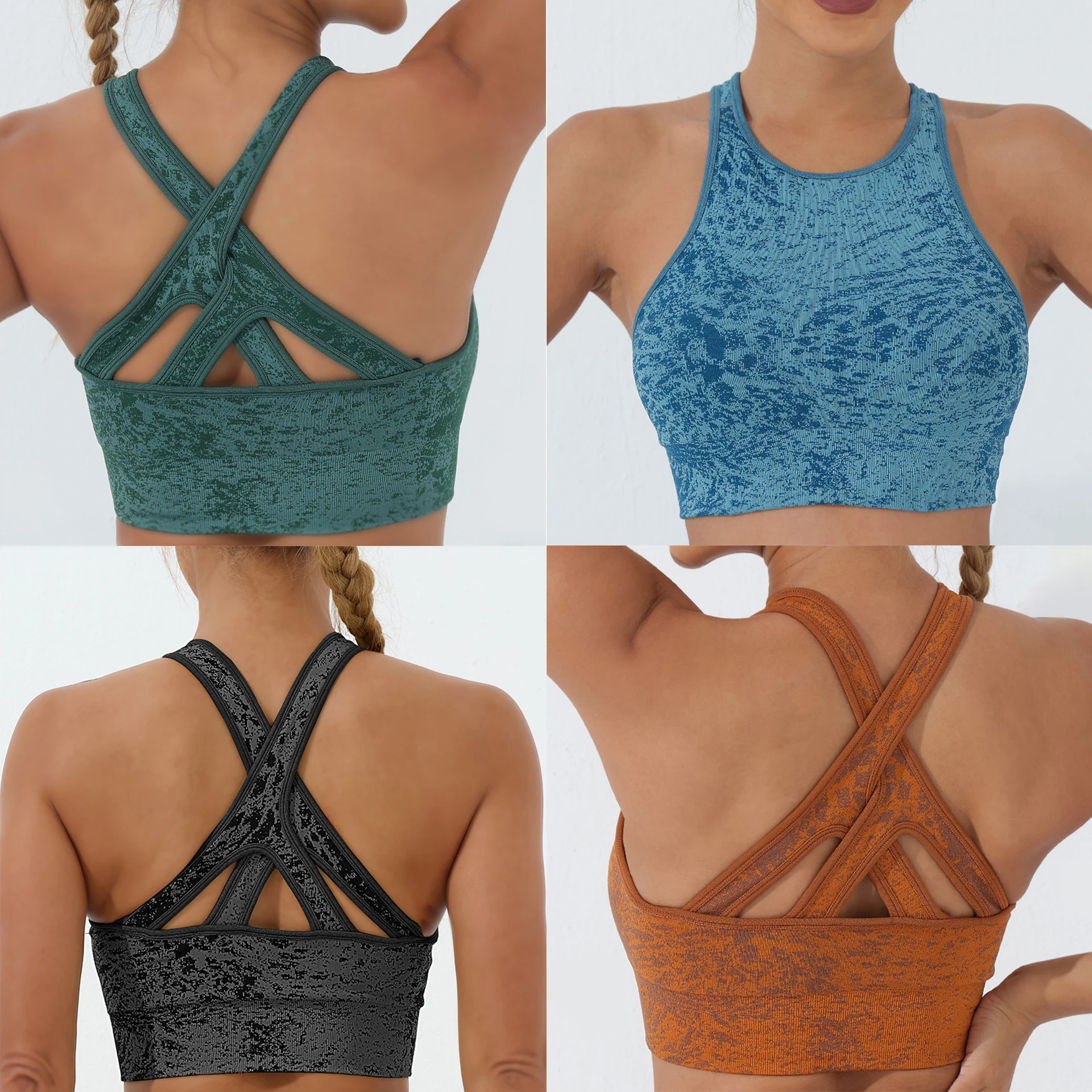 Seamless Cross Back Padded Strapped Crop Top Breathable Leopard Print Yoga Sports Bra for Women