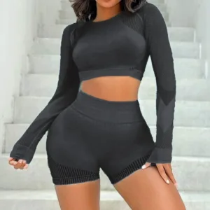 Product Name | Wholesale Women Exercise Sets Seamless Slim Fit Long Sleeve Crop Top Yoga Leggings Biker Shorts Solid Two Piece Yoga Sets |